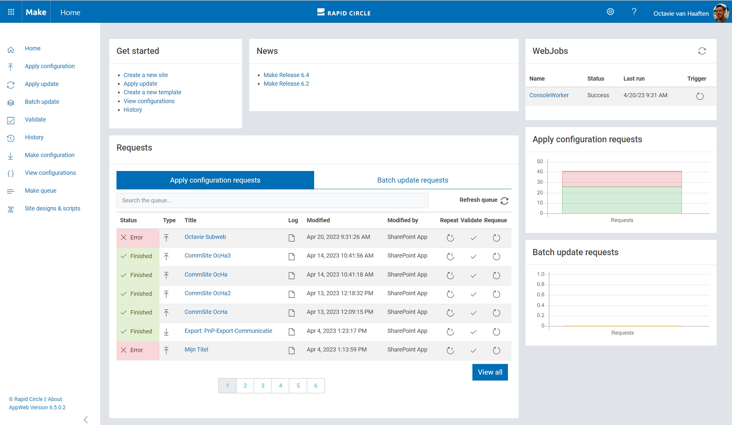 A request contains information to provision or update a new SharePoint site, Office 365 group or Team. When creating a new request on the Apply configuration page it is added to the top of the table and the Status is ‘Queued’. When a webJob is triggered this will grab a request and begin provisioning. For more information about this table see the Make Queue chapter of this document.