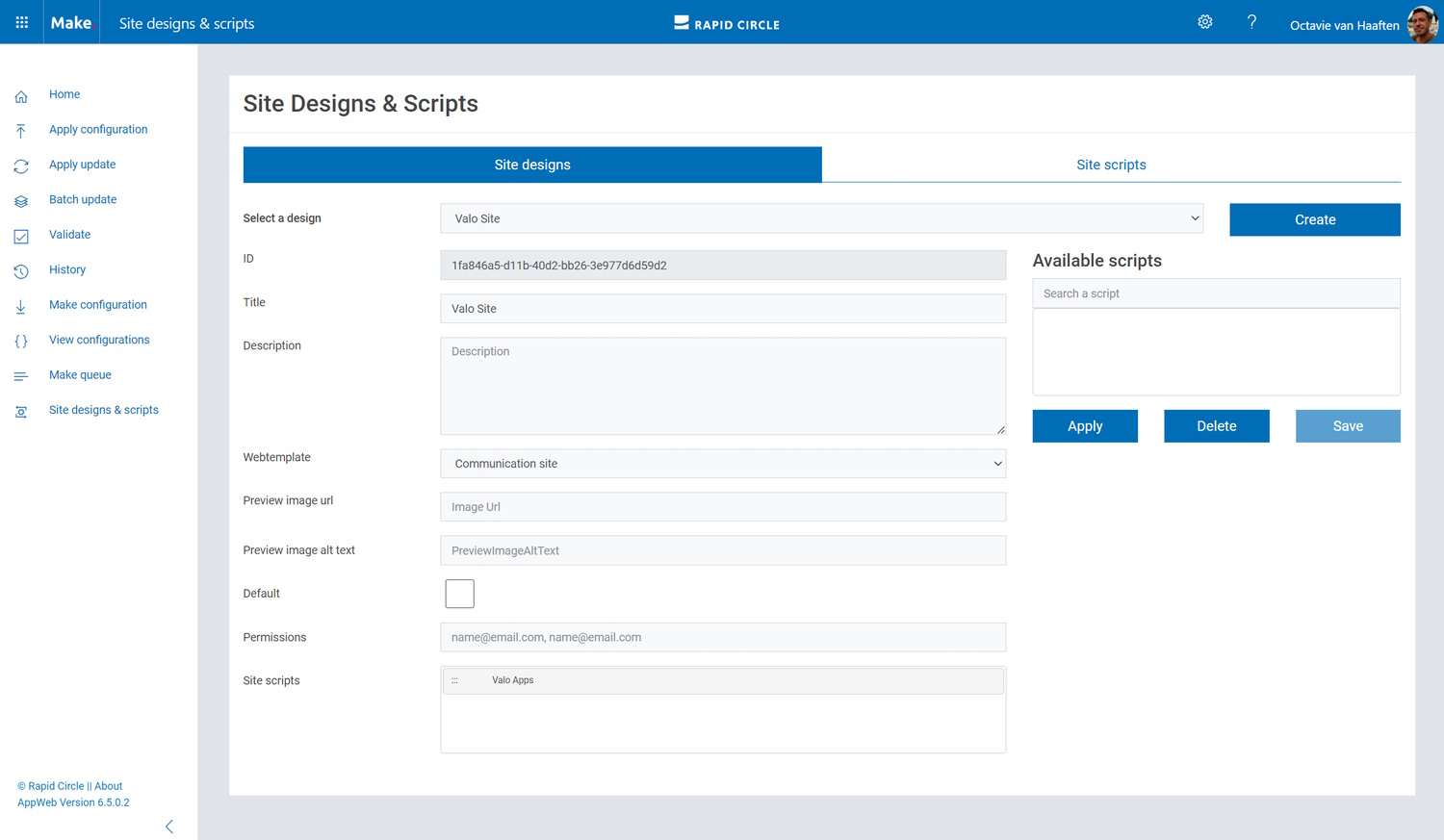 Click on ‘Site scripts’ to open up the Site script creation interface (figure 9). Click on ‘Create’ to create a new Site script or use the dropdown menu to select and edit an existing site script. Use the Save and Delete buttons to either Save a new version of the site script or delete it.