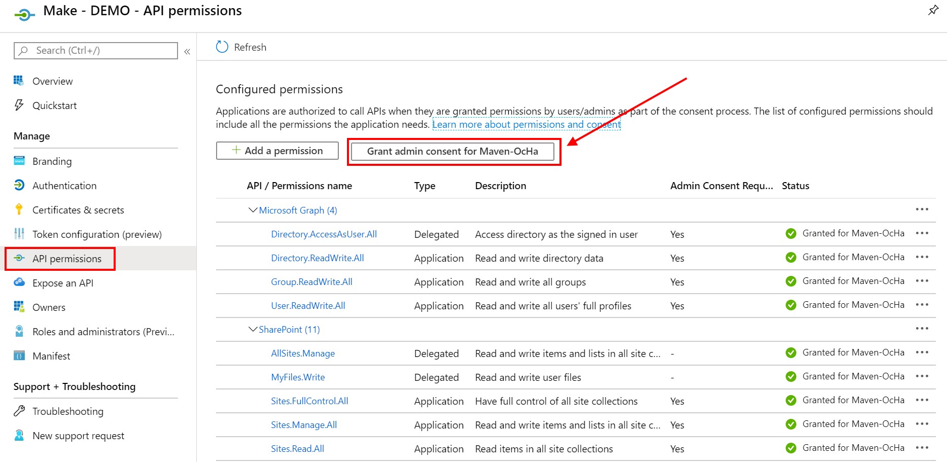 - Select the created App (E.g. Make) and from the blade, select API permissions.