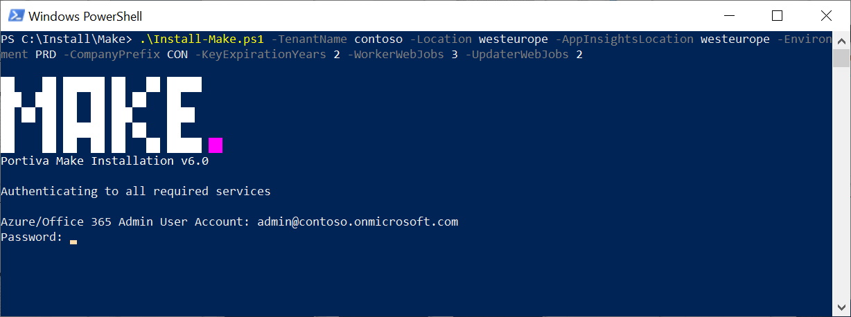 .\Install-Make.ps1 -Environment TST -TenantName rapidcircle -CompanyPrefix RC -ConfigFile “D:\InstallMake\MakeResources.config”