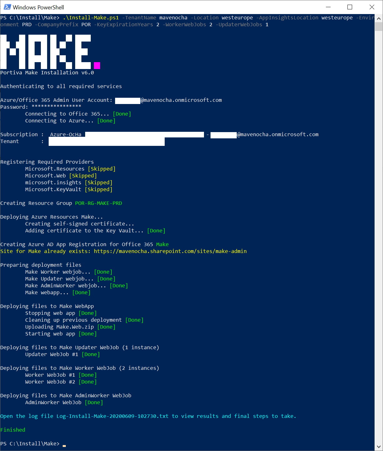 If you are confident with PowerShell and troubleshooting Azure and Office 365 environments, you have the option to automate the installation of Make. Almost every resource and configuration will be created, provisioned and relevant information will be logged. This is quite useful for your administration.