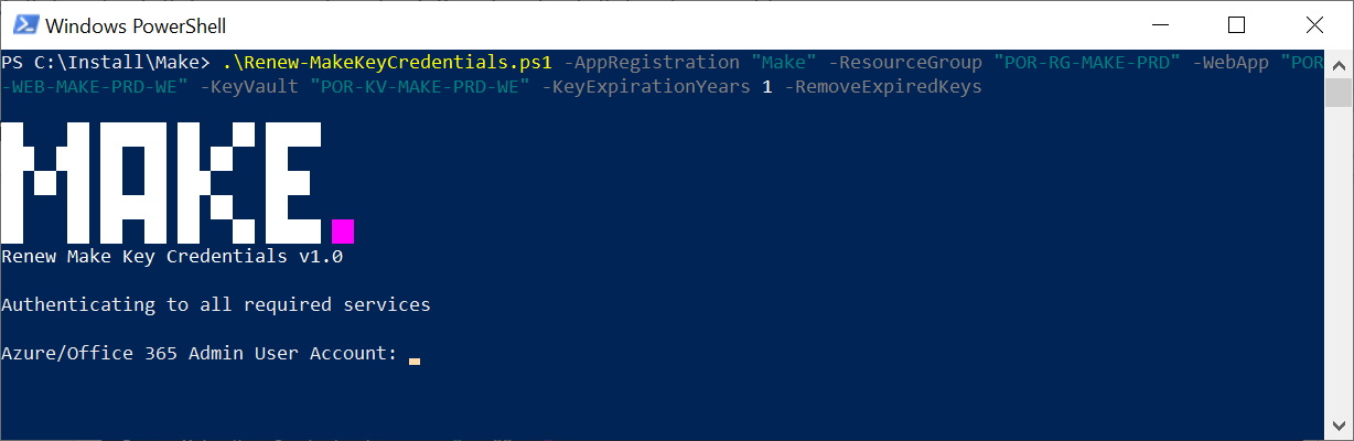.\Renew-MakeKeyCredentials.ps1 -AppRegistration “Make - DEMO” -ResourceGroup “CON-RG-MAKE-DEMO” -WebApp “CON-WEB-MAKE-DEMO-WE” -KeyVault “CON-KV-MAKE-DEMO-WE” -KeyExpirationYears 1 -RemoveExpiredKeys