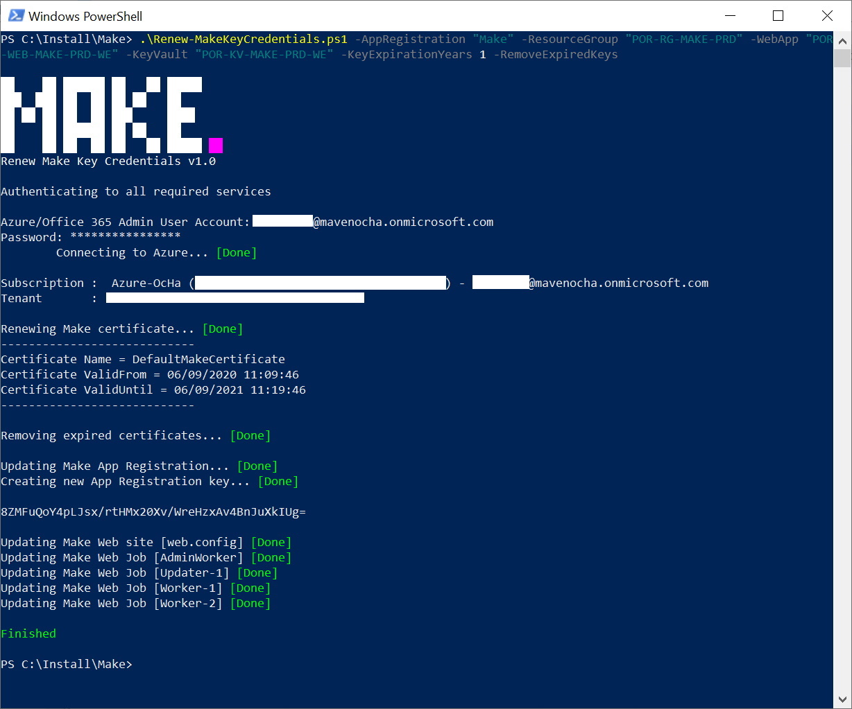 There are 2 components that use key credentials: the Make App Registration in Azure AD and the Make certificate file in the Azure KeyVault. To renew these, a PowerShell script is available that creates new key credentials and updates all Make configuration files.