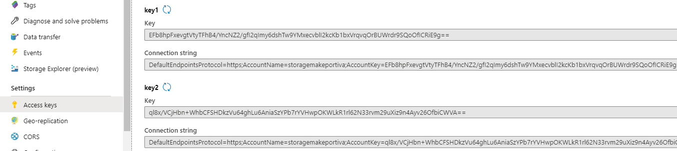 Next, the storage account connection string needs to be added to the Web.config and App.config files: Click on the storage account in its resource group after it has been created. Click on the Access keys menu item under Settings. In this window copy the connection string from key 1.