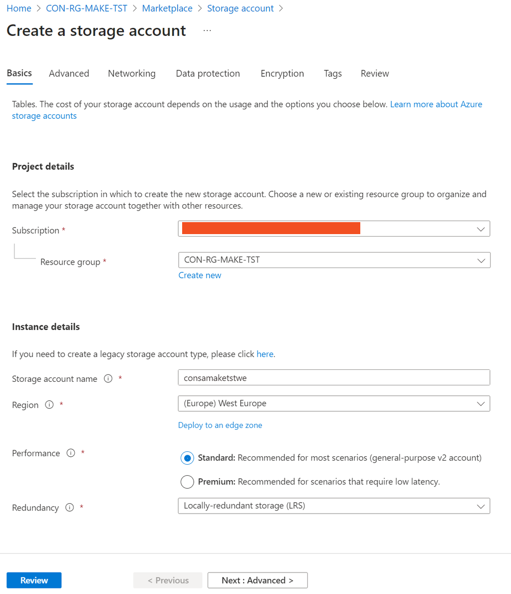 Go to the overview page of your Make resource group. Click on “Create” and search for “Storage Account”, click on it and on the next window click “Create”. Enter a name for the storage account. This name should be globally unique. The name can only contain lowercase letters and numbers, a good format would be storagemakecompanyname. Choose the correct location. Select the Make resource group. For “Replication”, we recommend at least “Geo-redundant storage (GRS)”. Keep the default values for the other settings and click on Review + create.