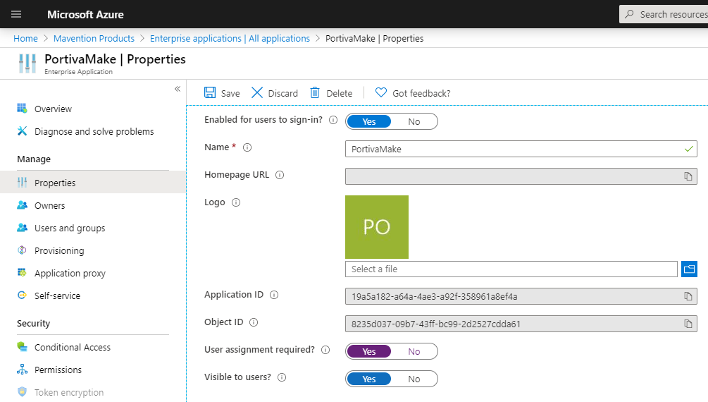 In the menu choose ‘Properties’ and set the value ‘User Assignment Required to ‘Yes’ and click on Save.