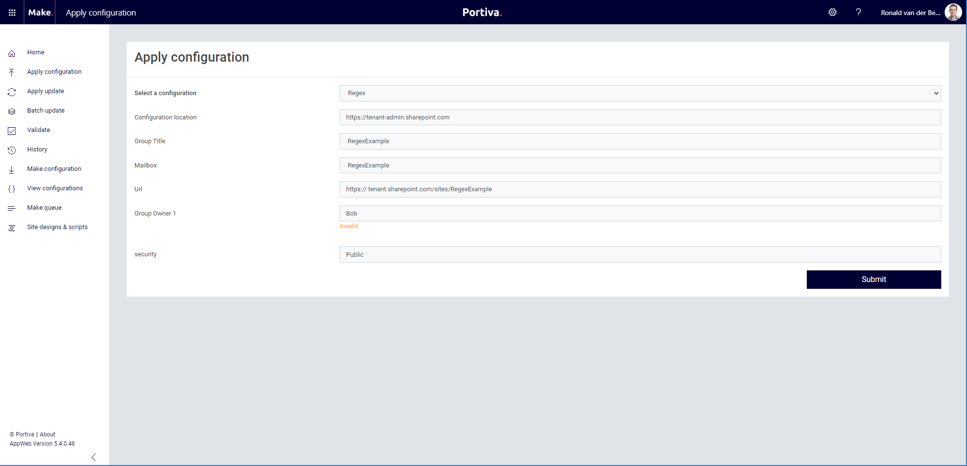 When Applying this configuration using the Make UI. A valid email address must be inserted in the “Group Owner 1” input box. If this is not the case an invalid message will appear and the configuration may not be submitted.